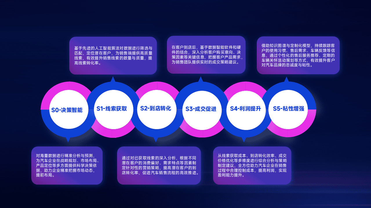 基于销售转化漏斗的薄弱环节,,为客户提供数据+模型+运营的智能应用,,,,实现销售业绩的提升;推动线索管理全链路的精细化管理和运营。。。。